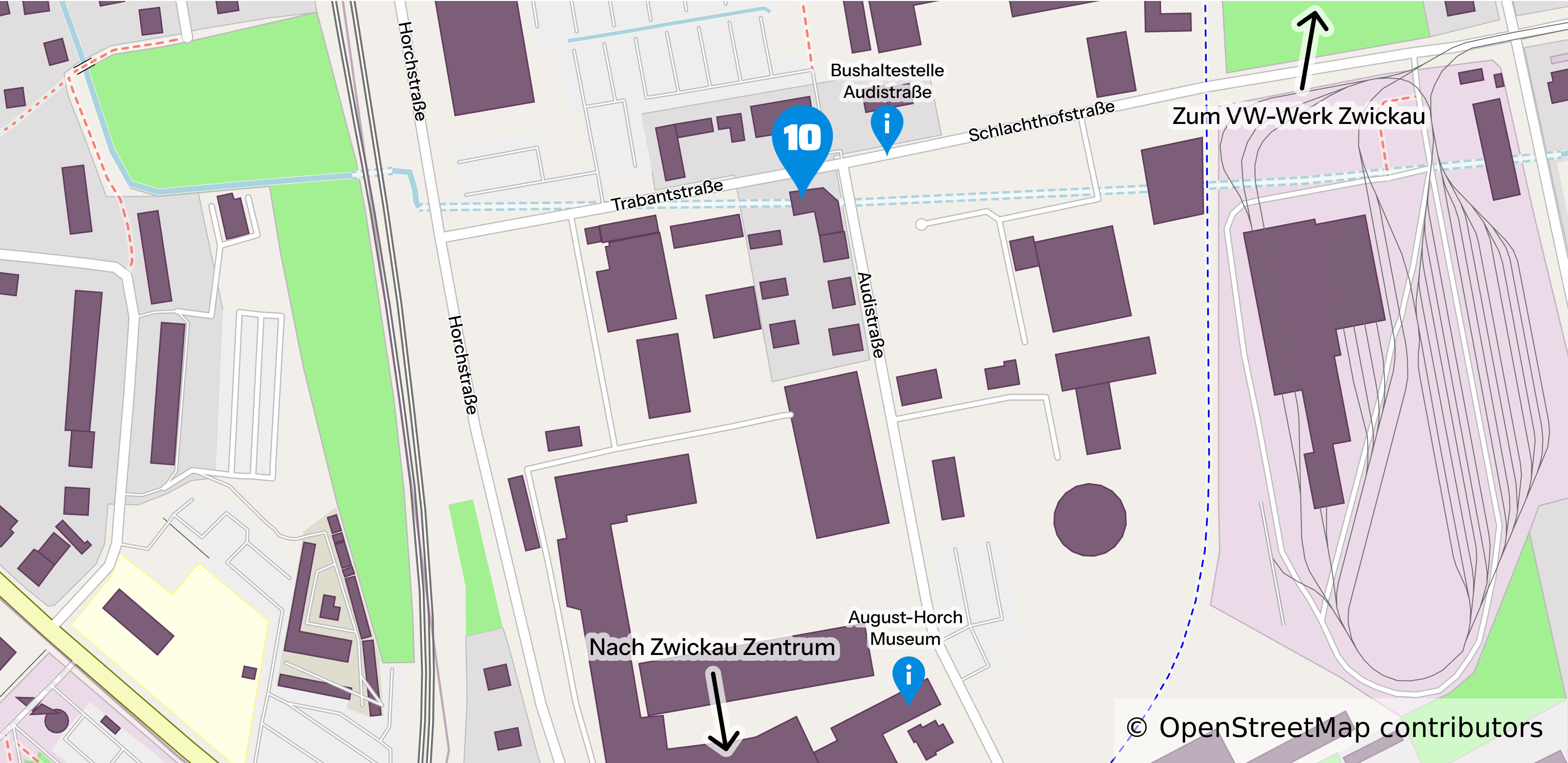 Die Trabantstraße 10 befindet sich innerhalb der Geburtsstadt der Auto Union, Zwickau, im Stadteil Pölbitz, in nächster Nähe zum Horch-Museum. Ebenfalls erreicht man in nur zehn Minuten mit dem Auto das VW-Werk Zwickau-Mosel.